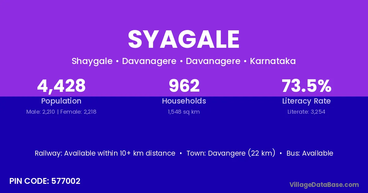 Davangere (22 km) is the nearest town to Syagale village for major economic activities and is located approximately 22 km away.
