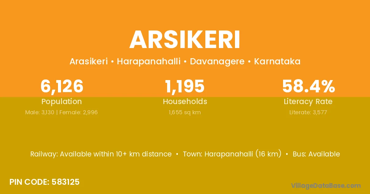 Arsikeri village has a total population of 6,126 people, of which 3,130 are males and 2,996 are females.