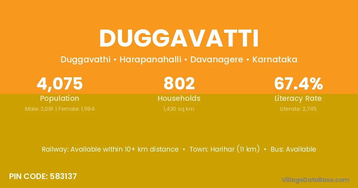 Harihar (11 km) is the nearest town to Duggavatti village for major economic activities and is located approximately 11 km away.