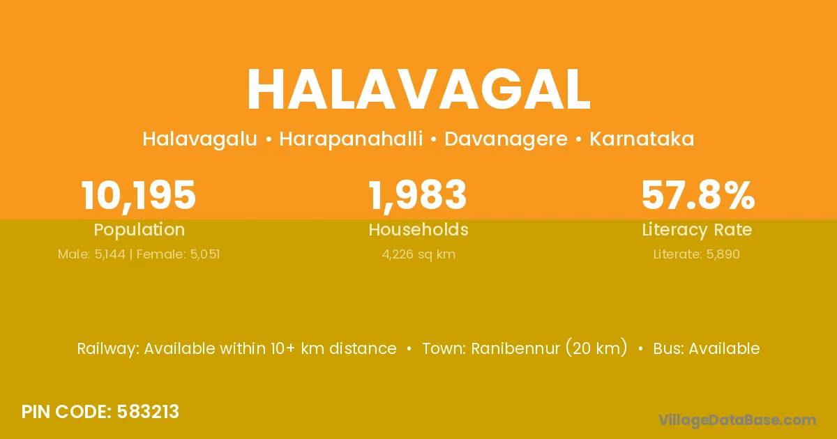 Ranibennur (20 km) is the nearest town to Halavagal village for major economic activities and is located approximately 20 km away.