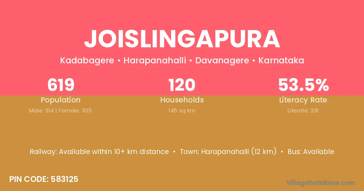 Harapanahalli (12 km) is the nearest town to Joislingapura village for major economic activities and is located approximately 12 km away.