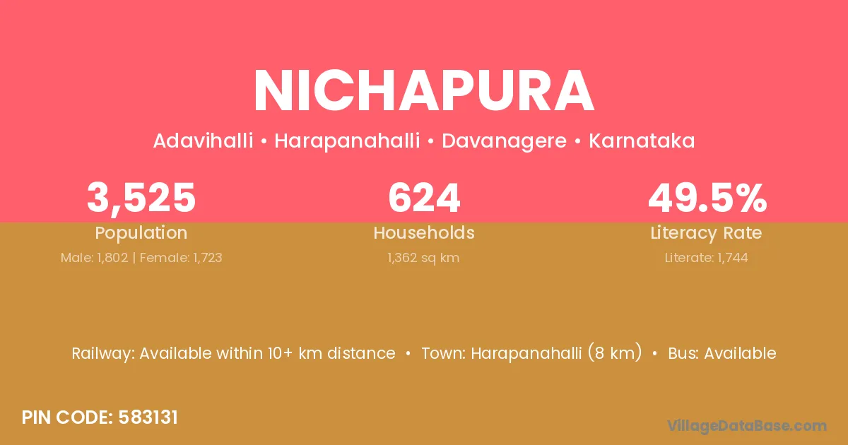 Harapanahalli (8 km) is the nearest town to Nichapura village for major economic activities and is located approximately 8 km away.