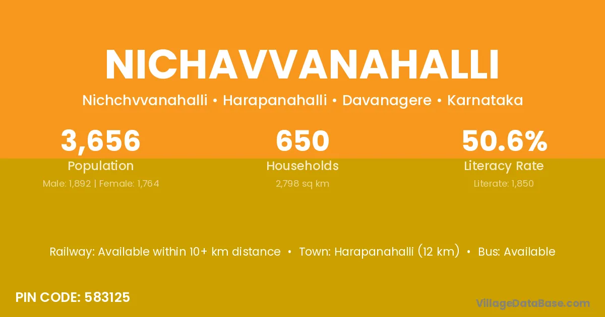 Nichavvanahalli village has a total population of 3,656 people, of which 1,892 are males and 1,764 are females.