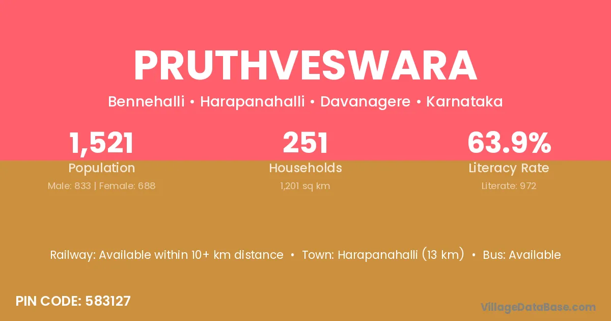 Harapanahalli (13 km) is the nearest town to Pruthveswara village for major economic activities and is located approximately 13 km away.
