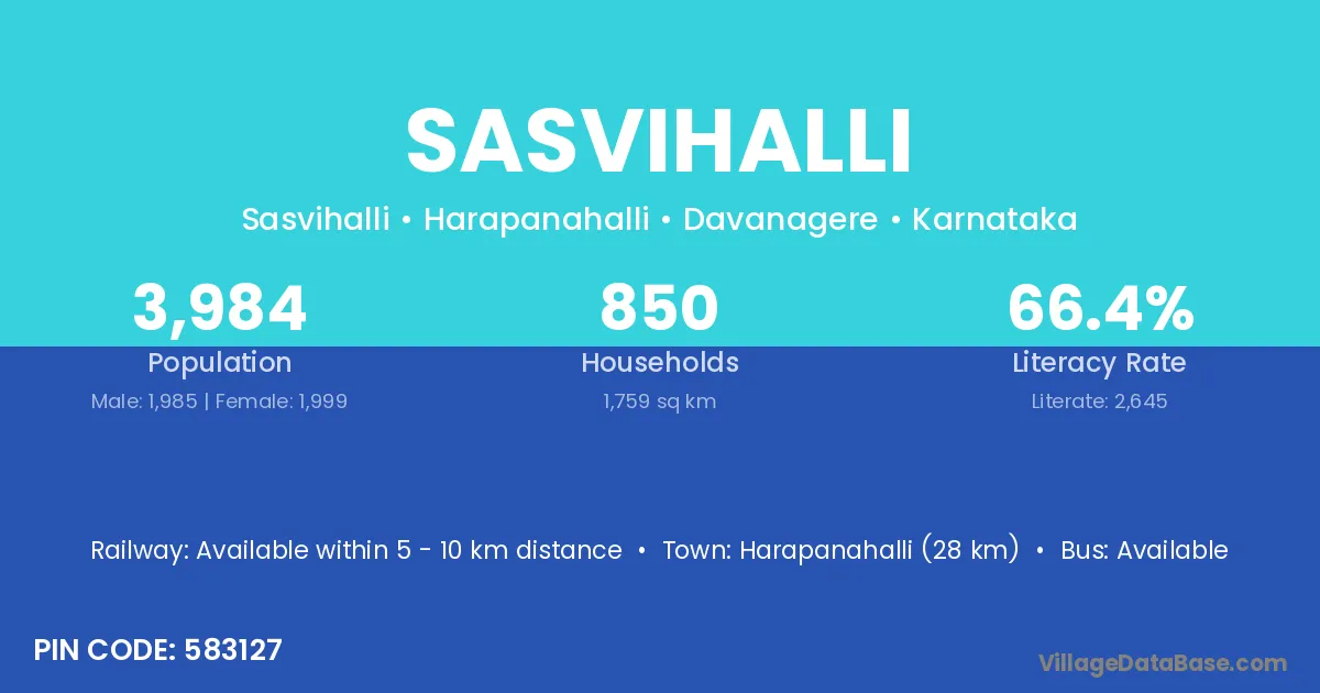 Harapanahalli (28 km) is the nearest town to Sasvihalli village for major economic activities and is located approximately 28 km away.
