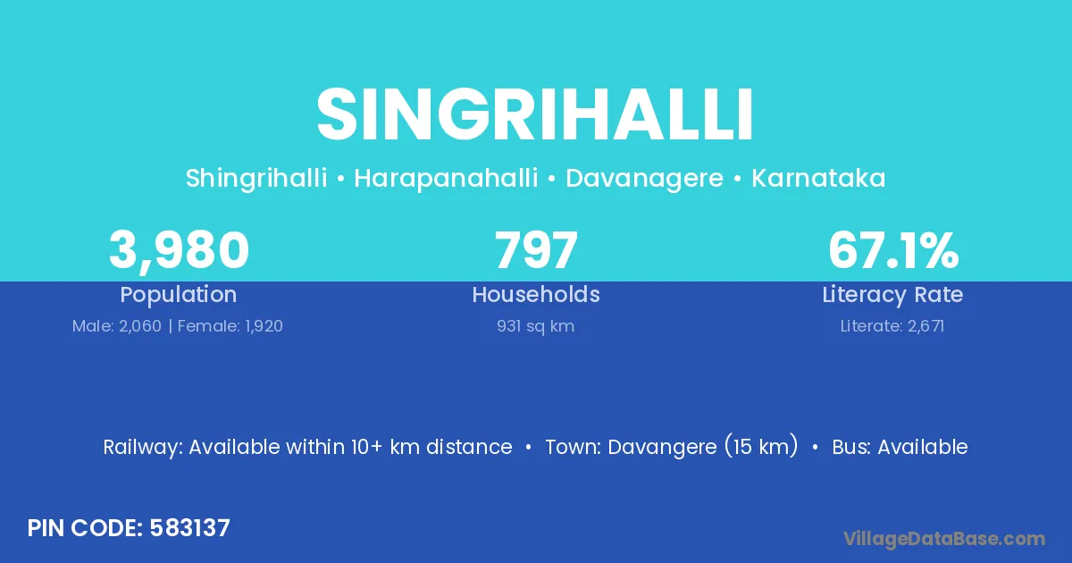 Davangere (15 km) is the nearest town to Singrihalli village for major economic activities and is located approximately 15 km away.
