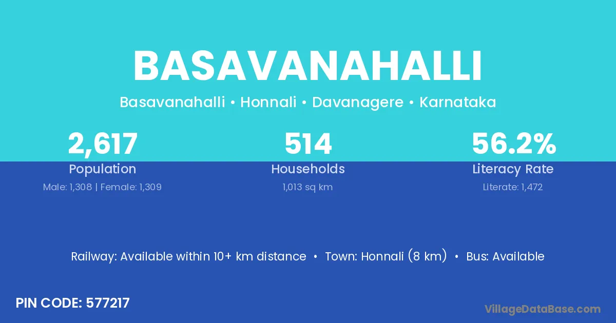 Honnali (8 km) is the nearest town to Basavanahalli village for major economic activities and is located approximately 8 km away.