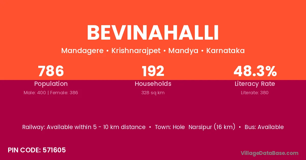 Bevinahalli village has a total population of 1,161 people, of which 612 are males and 549 are females.