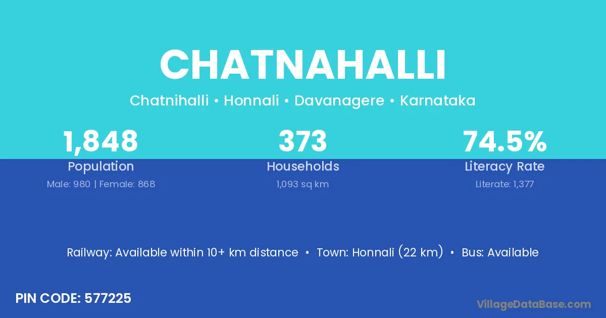 Honnali (22 km) is the nearest town to Chatnahalli village for major economic activities and is located approximately 22 km away.