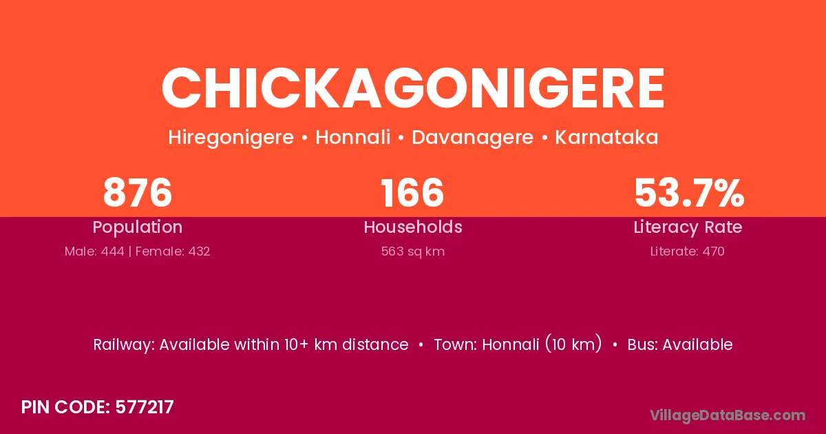 Honnali (10 km) is the nearest town to Chickagonigere village for major economic activities and is located approximately 10 km away.