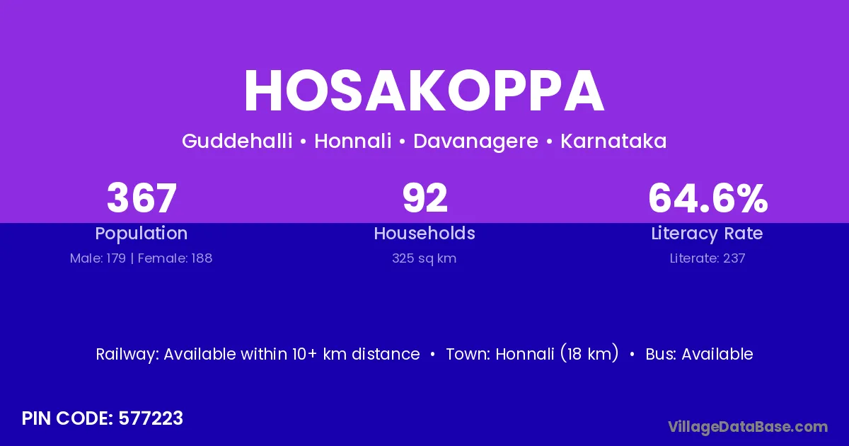 Honnali (18 km) is the nearest town to Hosakoppa village for major economic activities and is located approximately 18 km away.