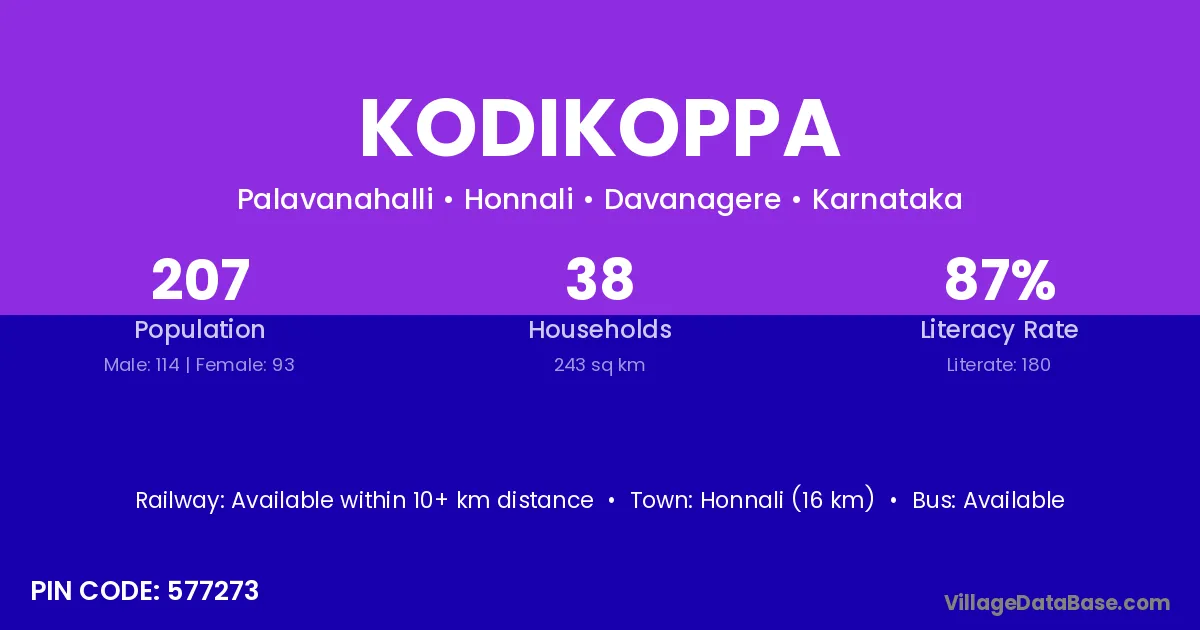 Honnali (16 km) is the nearest town to Kodikoppa village for major economic activities and is located approximately 16 km away.
