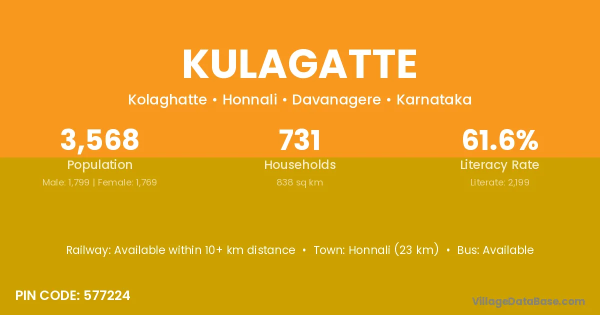 Honnali (23 km) is the nearest town to Kulagatte village for major economic activities and is located approximately 23 km away.
