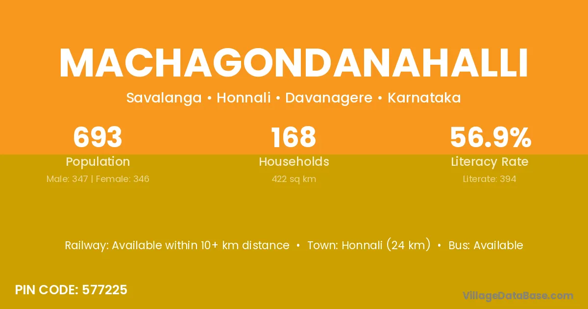 Honnali (24 km) is the nearest town to Machagondanahalli village for major economic activities and is located approximately 24 km away.