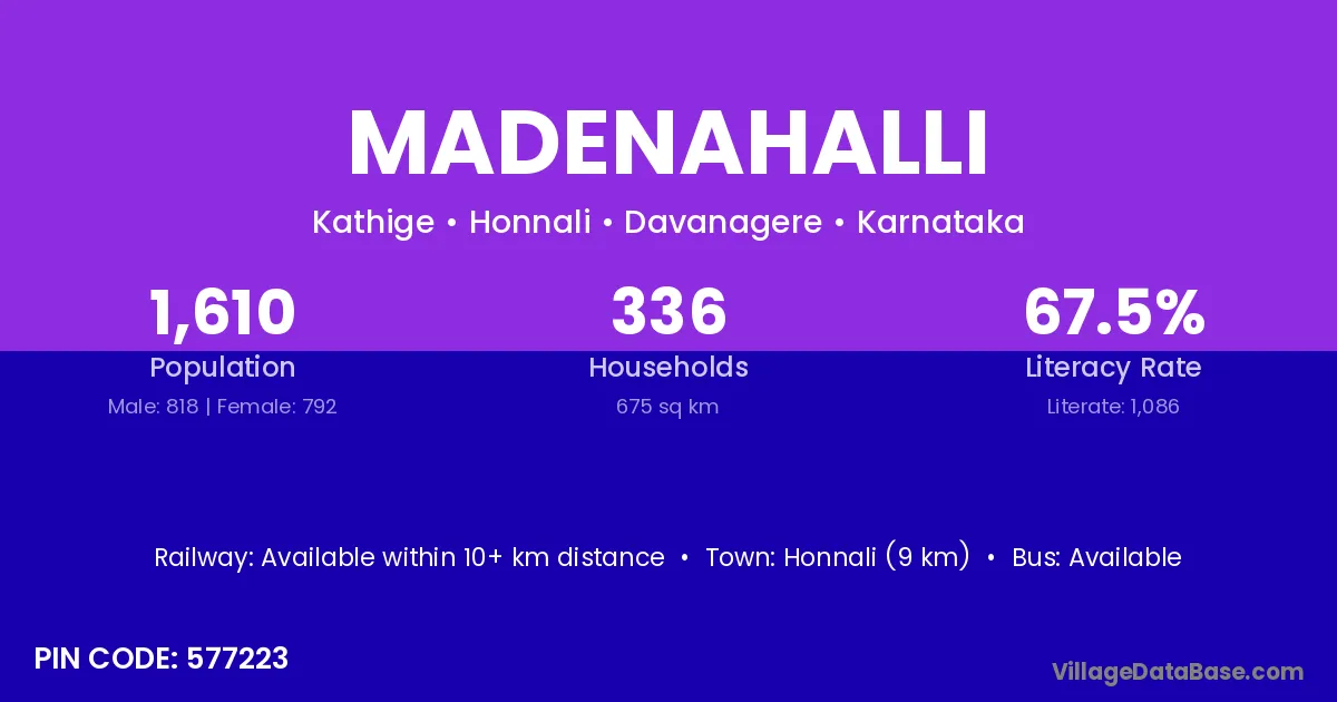 Honnali (9 km) is the nearest town to Madenahalli village for major economic activities and is located approximately 9 km away.