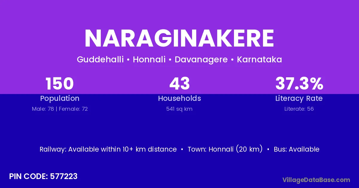 Honnali (20 km) is the nearest town to Naraginakere village for major economic activities and is located approximately 20 km away.