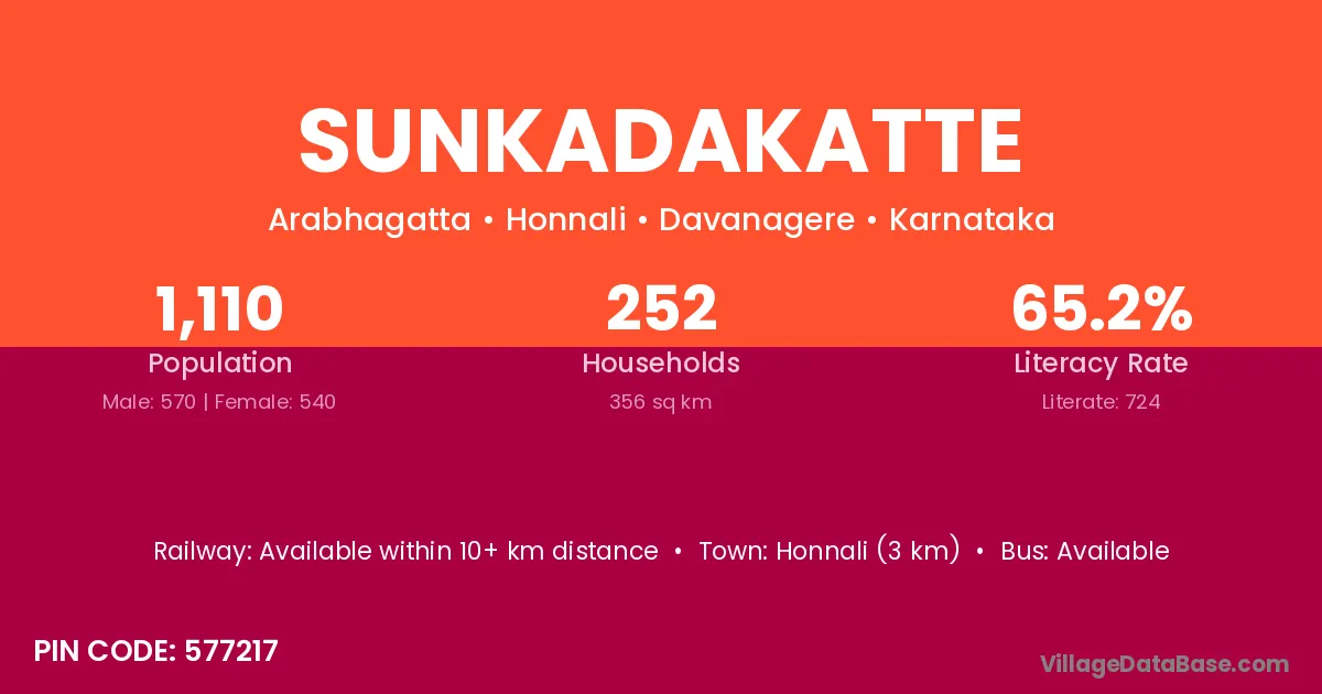 Honnali (3 km) is the nearest town to Sunkadakatte village for major economic activities and is located approximately 3 km away.
