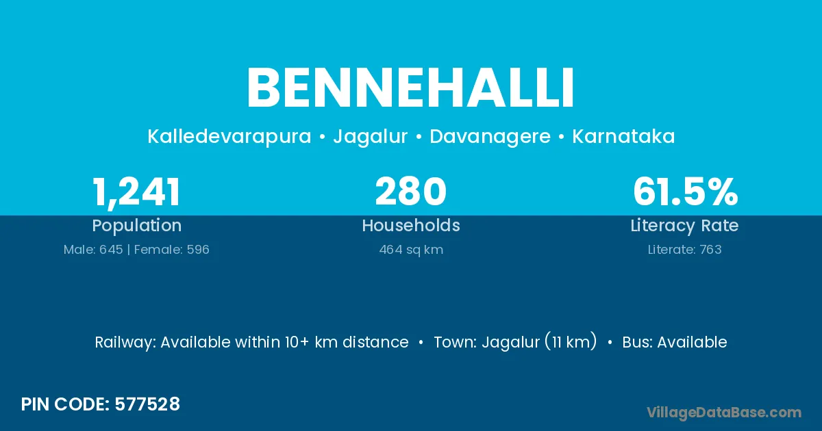 Jagalur (11 km) is the nearest town to Bennehalli village for major economic activities and is located approximately 11 km away.