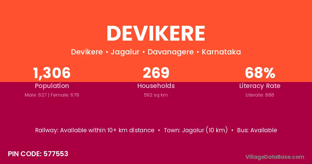 Jagalur (10 km) is the nearest town to Devikere village for major economic activities and is located approximately 10 km away.