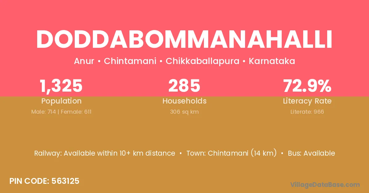 The literacy rate of Doddabommanahalli village is 76.85%. Male literacy stands at 81.48% and female literacy at 71.58%.