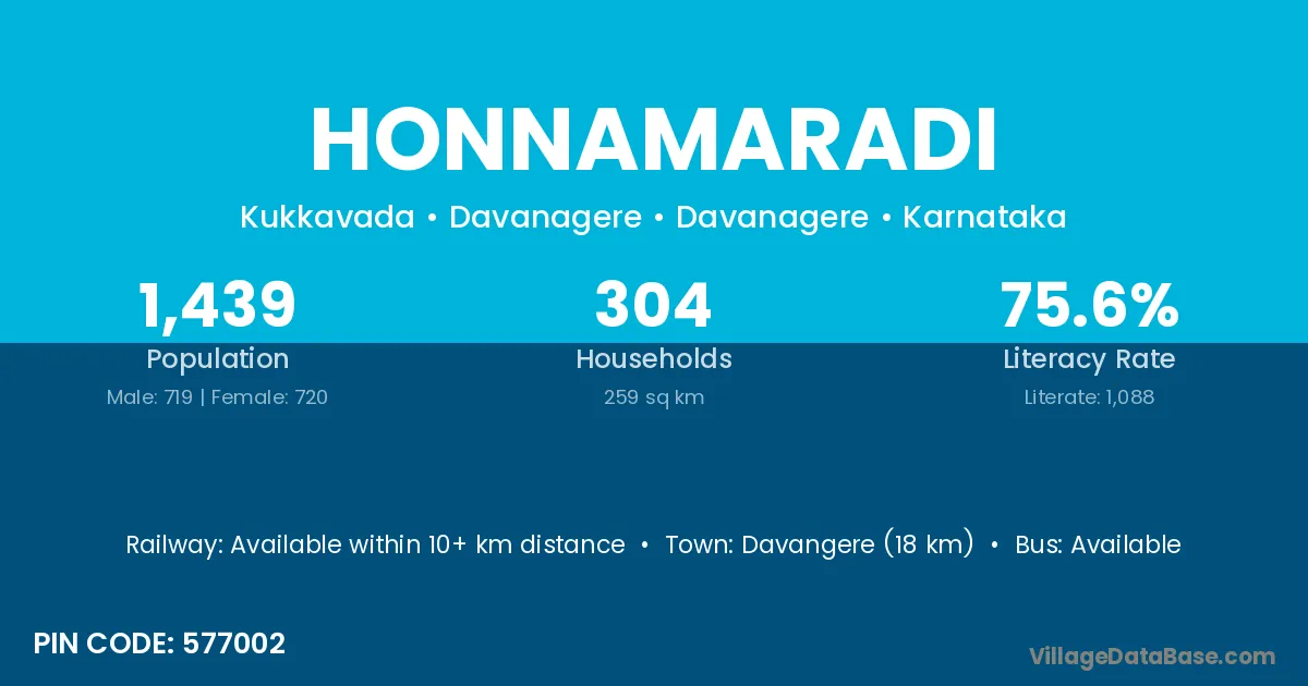 Jagalur (16 km) is the nearest town to Honnamaradi village for major economic activities and is located approximately 16 km away.