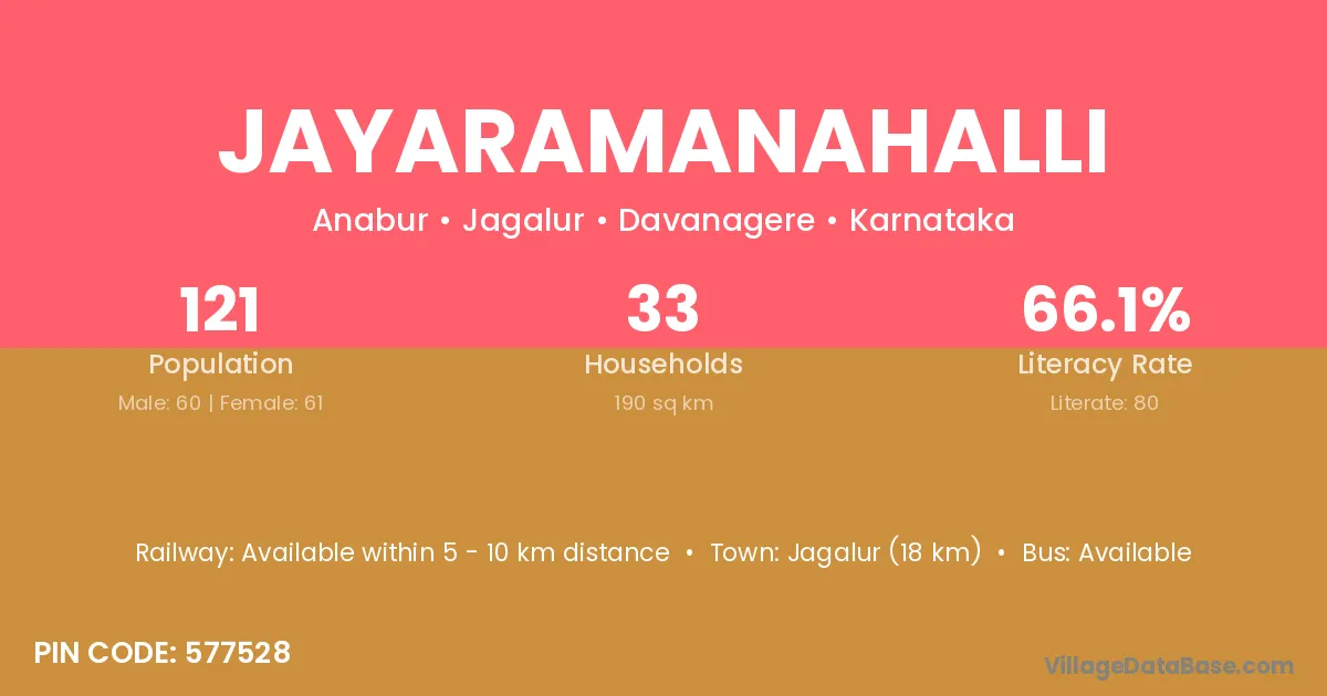 Jayaramanahalli village has a total population of 121 people, of which 60 are males and 61 are females.