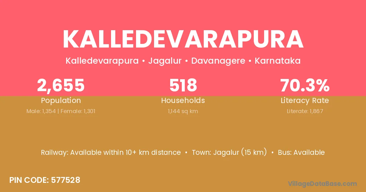 Kalledevarapura village has a total population of 2,655 people, of which 1,354 are males and 1,301 are females.
