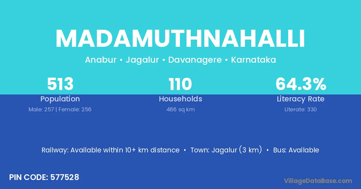 Jagalur (3 km) is the nearest town to Madamuthnahalli village for major economic activities and is located approximately 3 km away.
