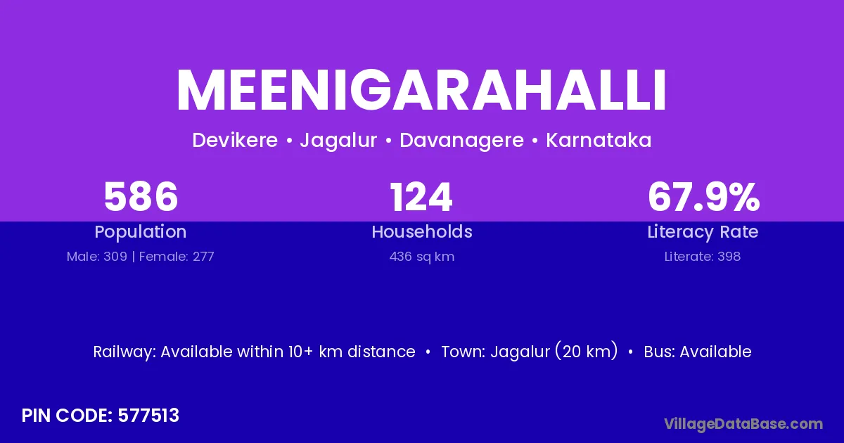 Meenigarahalli village has a total population of 586 people, of which 309 are males and 277 are females.