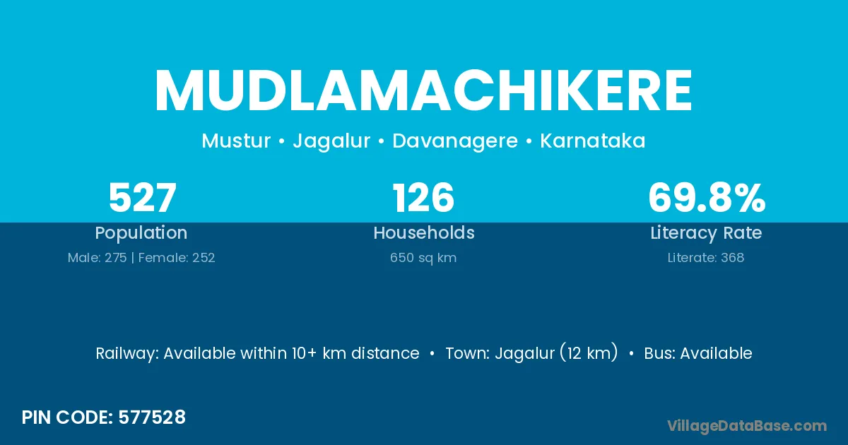 Jagalur (12 km) is the nearest town to Mudlamachikere village for major economic activities and is located approximately 12 km away.