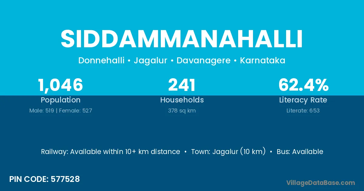 Jagalur (10 km) is the nearest town to Siddammanahalli village for major economic activities and is located approximately 10 km away.