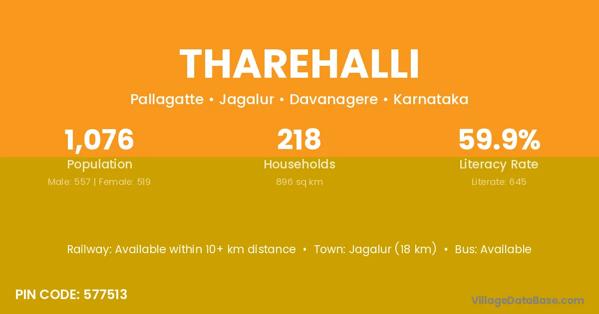 Jagalur (18 km) is the nearest town to Tharehalli village for major economic activities and is located approximately 18 km away.