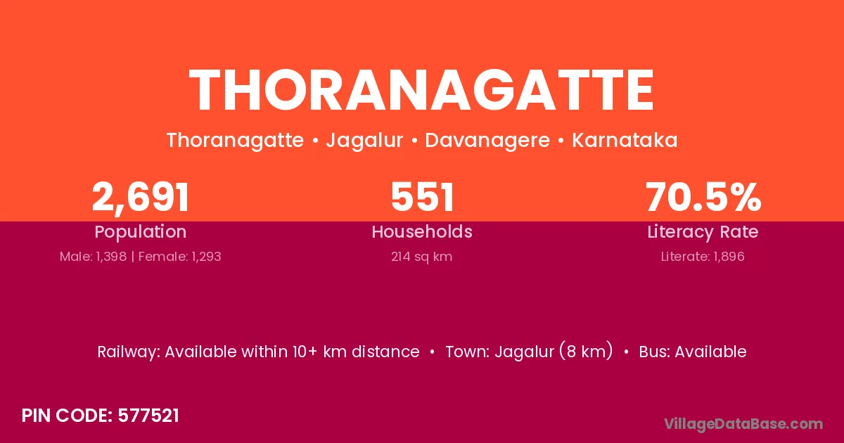 Jagalur (8 km) is the nearest town to Thoranagatte village for major economic activities and is located approximately 8 km away.