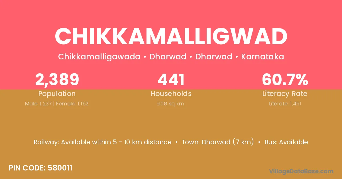 Dharwad (7 km) is the nearest town to Chikkamalligwad village for major economic activities and is located approximately 7 km away.