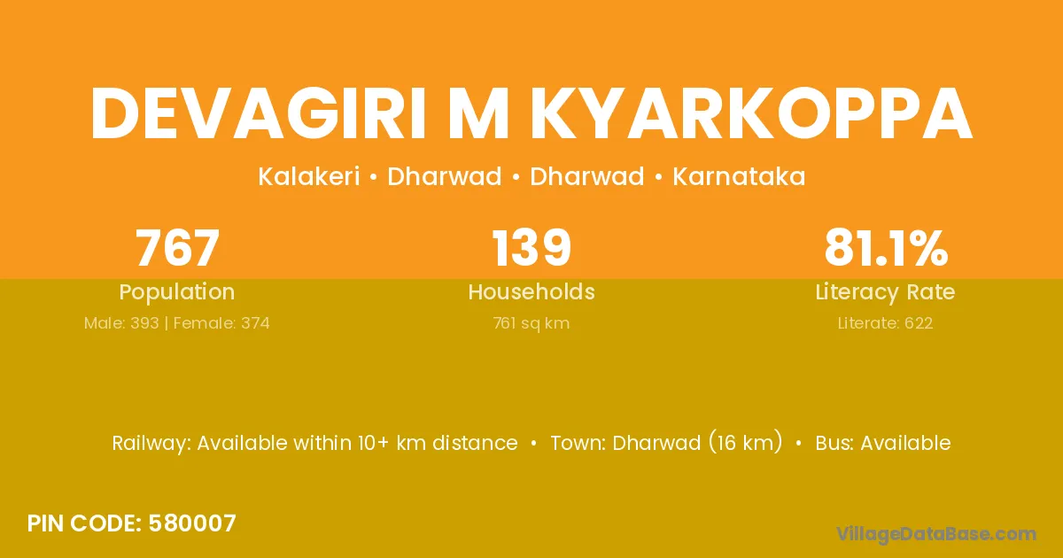 Dharwad (16 km) is the nearest town to Devagiri M Kyarkoppa village for major economic activities and is located approximately 16 km away.