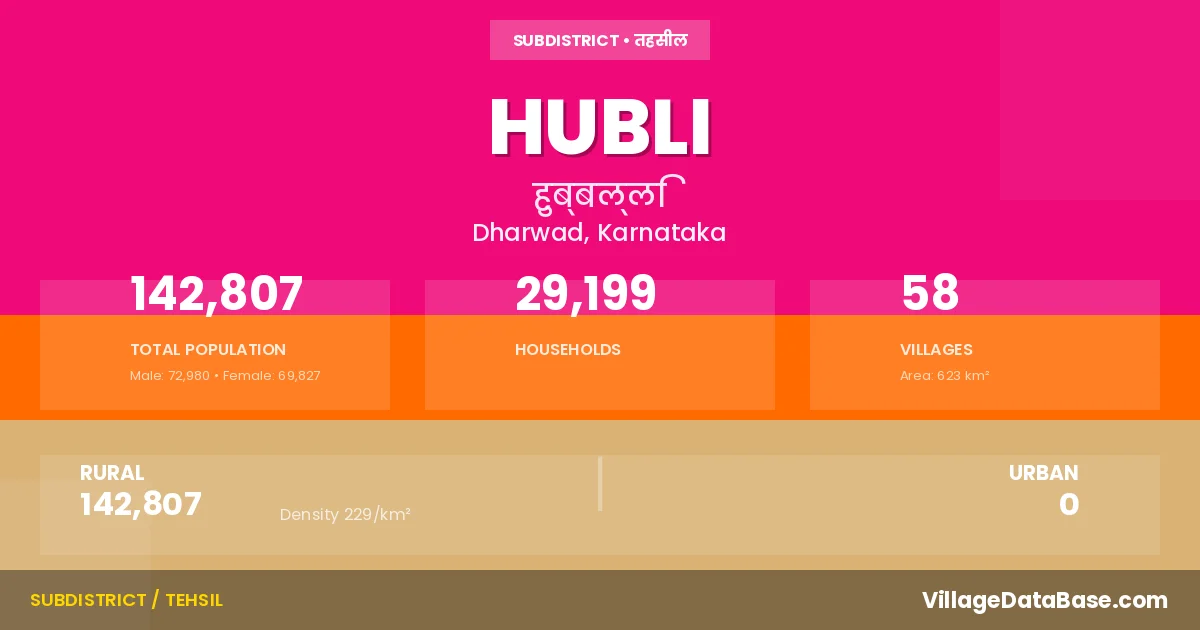 According to the 2011 census The total area of Hubli Taluka is 623 km², with a population of 142807 people. The population density is 229 inhabitants per square kilometre, and there are approximately 29199 houses in the sub district.