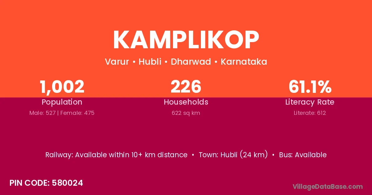 Hubli (24 km) is the nearest town to Kamplikop village for major economic activities and is located approximately 24 km away.