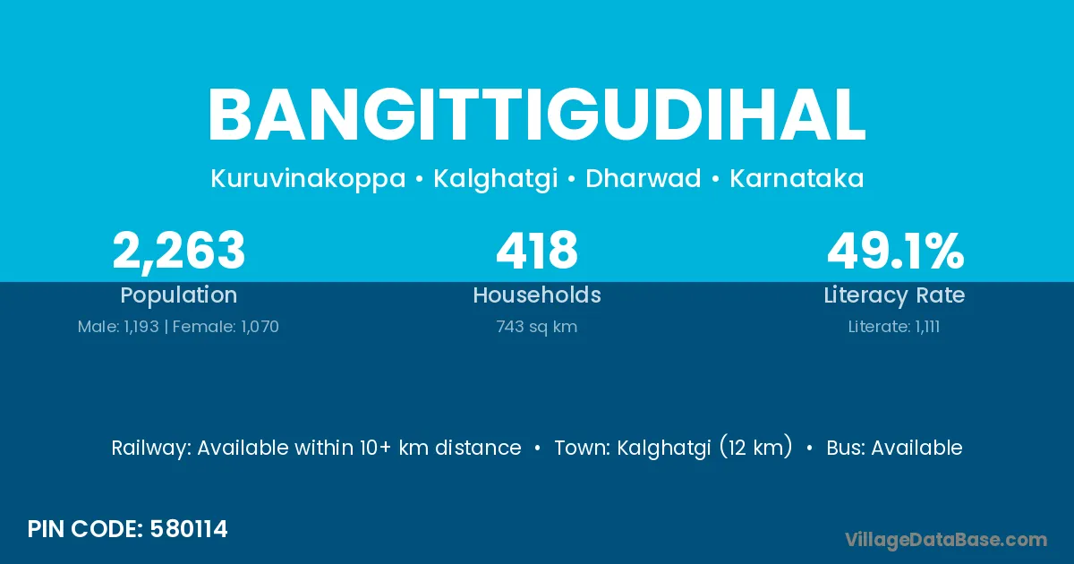 Kalghatgi (12 km) is the nearest town to Bangittigudihal village for major economic activities and is located approximately 12 km away.