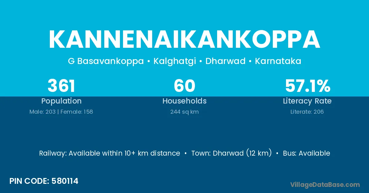 Dharwad (12 km) is the nearest town to Kannenaikankoppa village for major economic activities and is located approximately 12 km away.