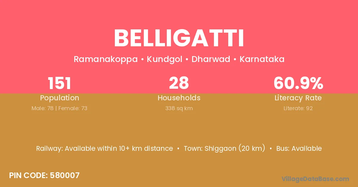 Shiggaon (20 km) is the nearest town to Belligatti village for major economic activities and is located approximately 20 km away.