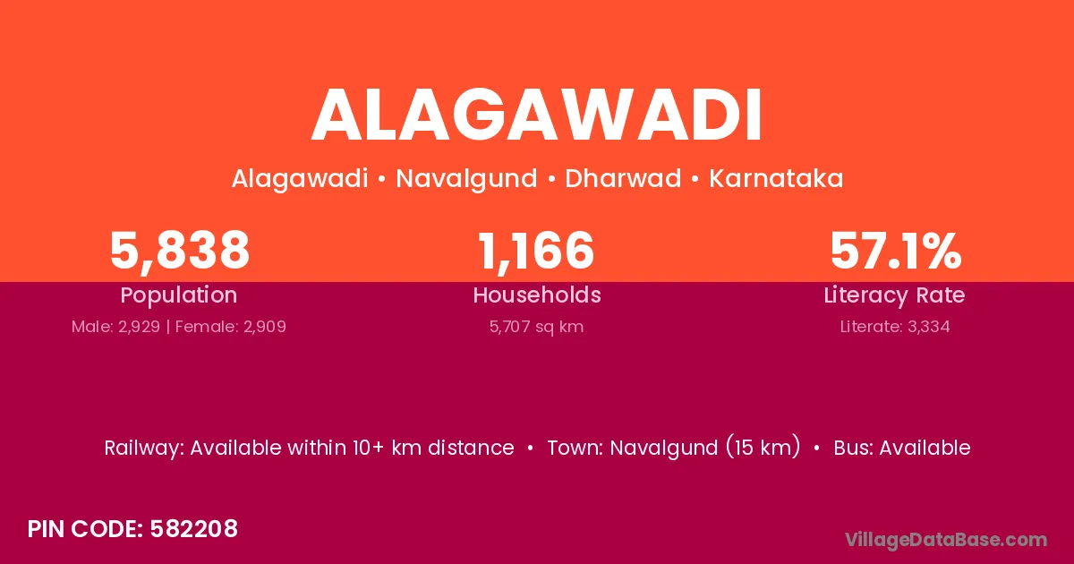 Alagawadi village has a total population of 5,838 people, of which 2,929 are males and 2,909 are females.