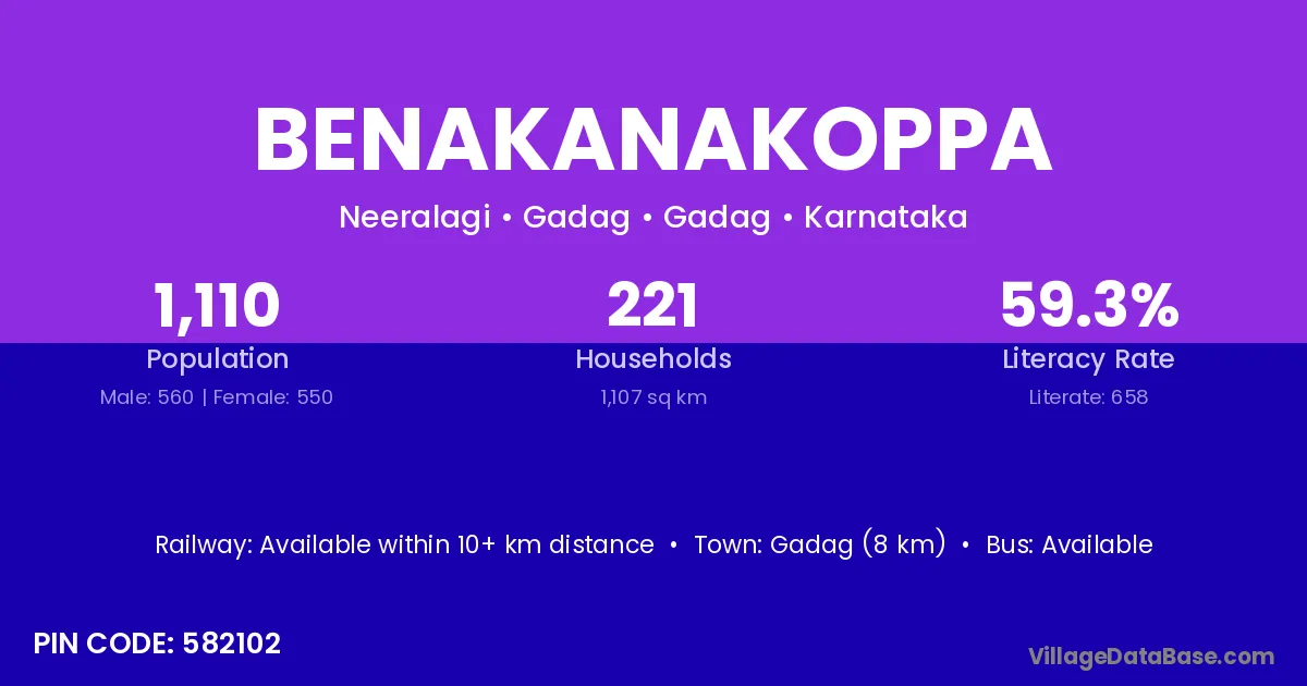 Benakanakoppa village has a total population of 1,110 people, of which 560 are males and 550 are females.