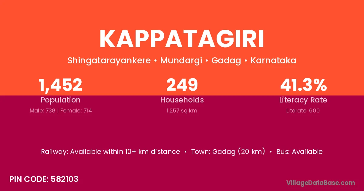 Gadag (20 km) is the nearest town to Kappatagiri village for major economic activities and is located approximately 20 km away.