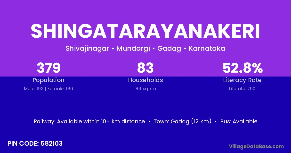 Gadag (12 km) is the nearest town to Shingatarayanakeri village for major economic activities and is located approximately 12 km away.