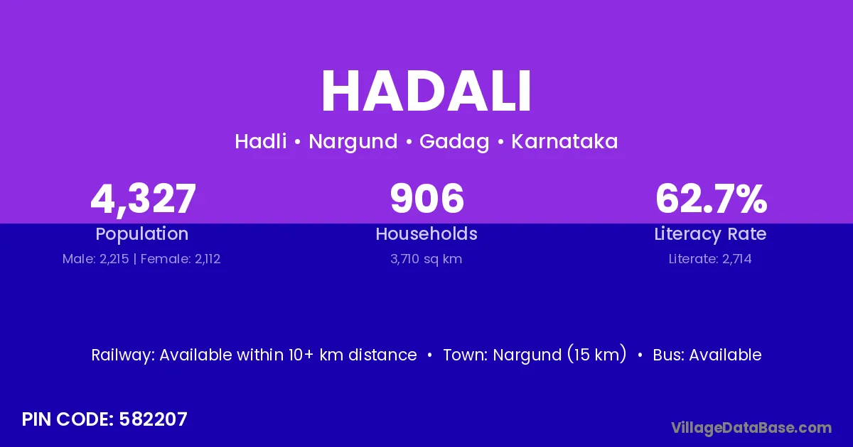 Nargund (15 km) is the nearest town to Hadali village for major economic activities and is located approximately 15 km away.