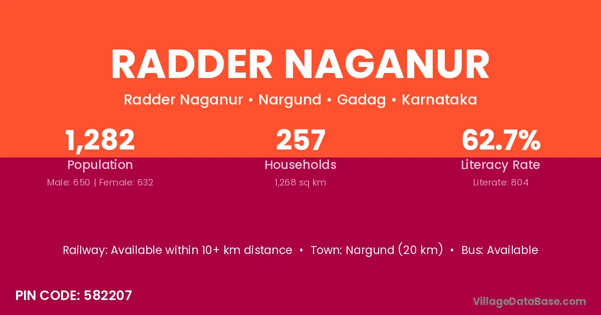 Nargund (20 km) is the nearest town to Radder Naganur village for major economic activities and is located approximately 20 km away.