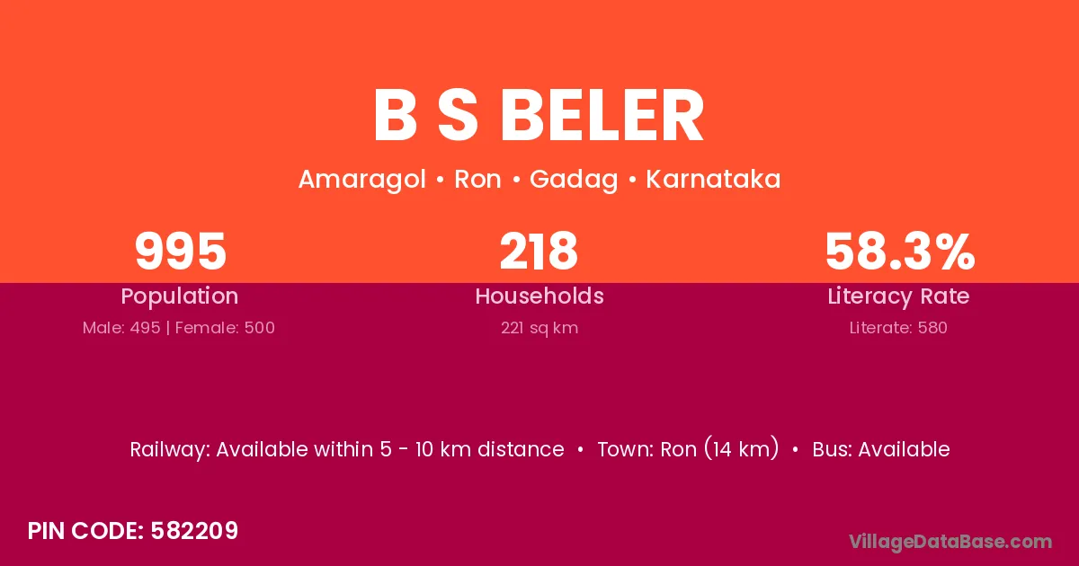 Ron (14 km) is the nearest town to B S Beler village for major economic activities and is located approximately 14 km away.