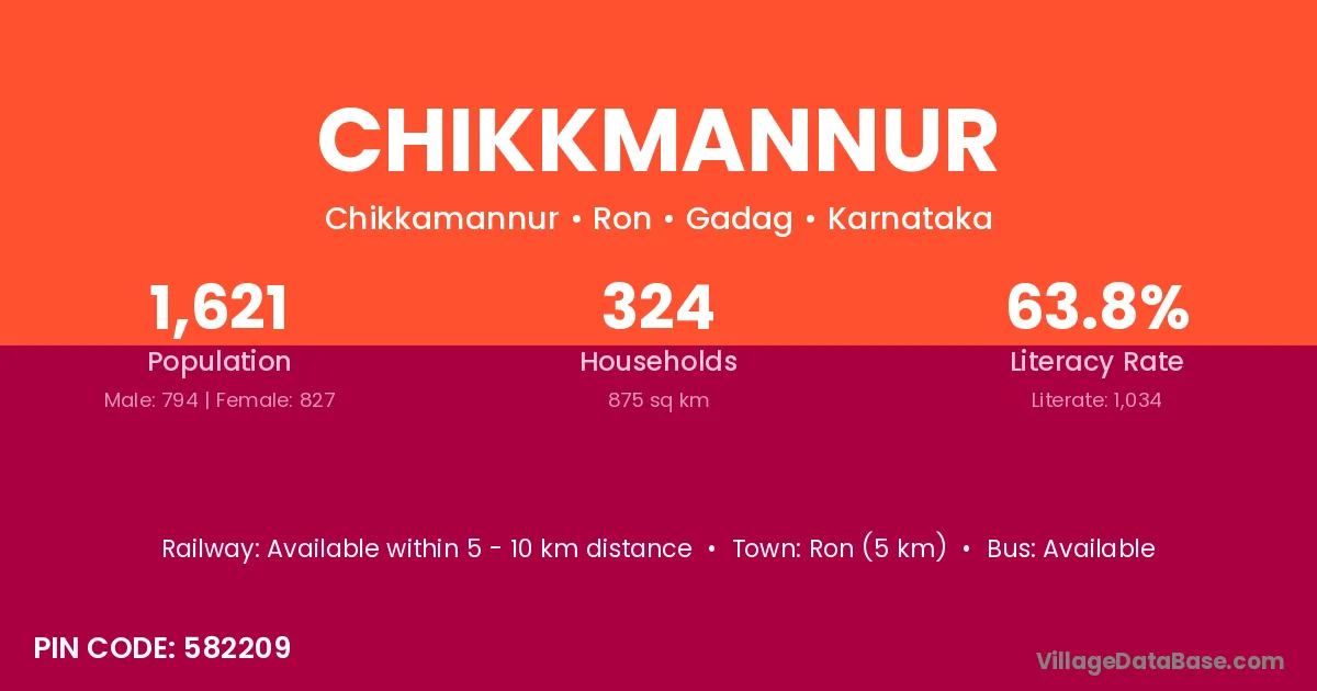 Chikkmannur village has a total population of 1,621 people, of which 794 are males and 827 are females.