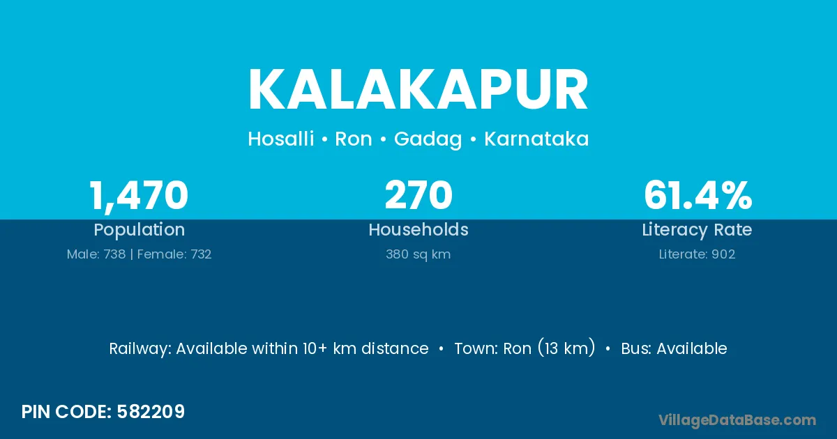 Ron (13 km) is the nearest town to Kalakapur village for major economic activities and is located approximately 13 km away.