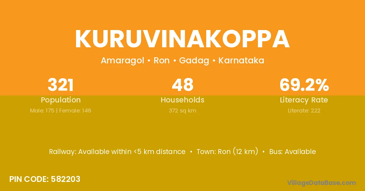 Ron (12 km) is the nearest town to Kuruvinakoppa village for major economic activities and is located approximately 12 km away.